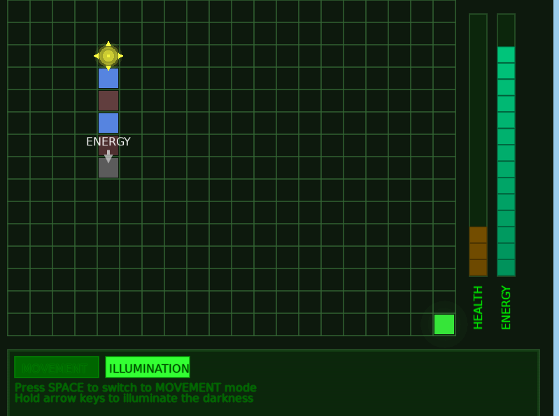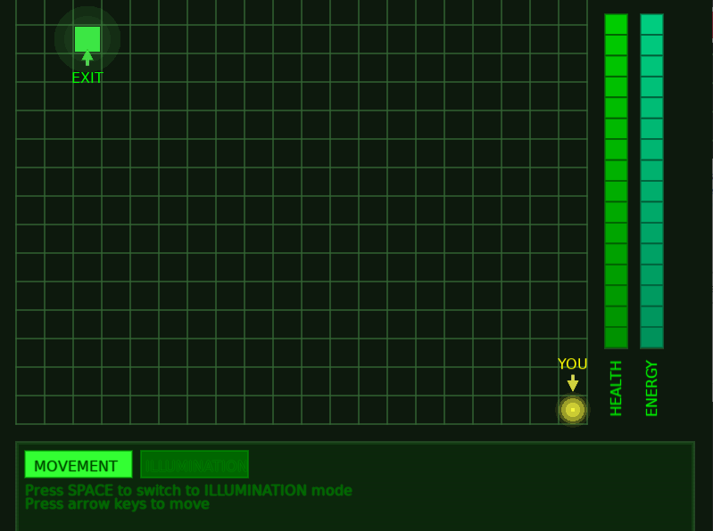 Use the SPACEBAR to switch back and forth between move and illumination modes. In move mode, the ARROW or WASD keys will allow you to traverse the grid, but be sure to stay on the path and avoid the danger zones that deplete your health! In illumination mode, use the ARROW/WASD keys to bring light to the darkness and see what awaits. While your illumination ability does use up energy, there are energy sources hidden throughout the grid for you to recharge -- but you might have to take some damage to get to them!